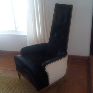 Beautifully re-covered in white cowhide and finished with antique bronze nailheads. Beautiful handcarved aged wood trim along sides Truly a one of a kind statement piece for any room or office